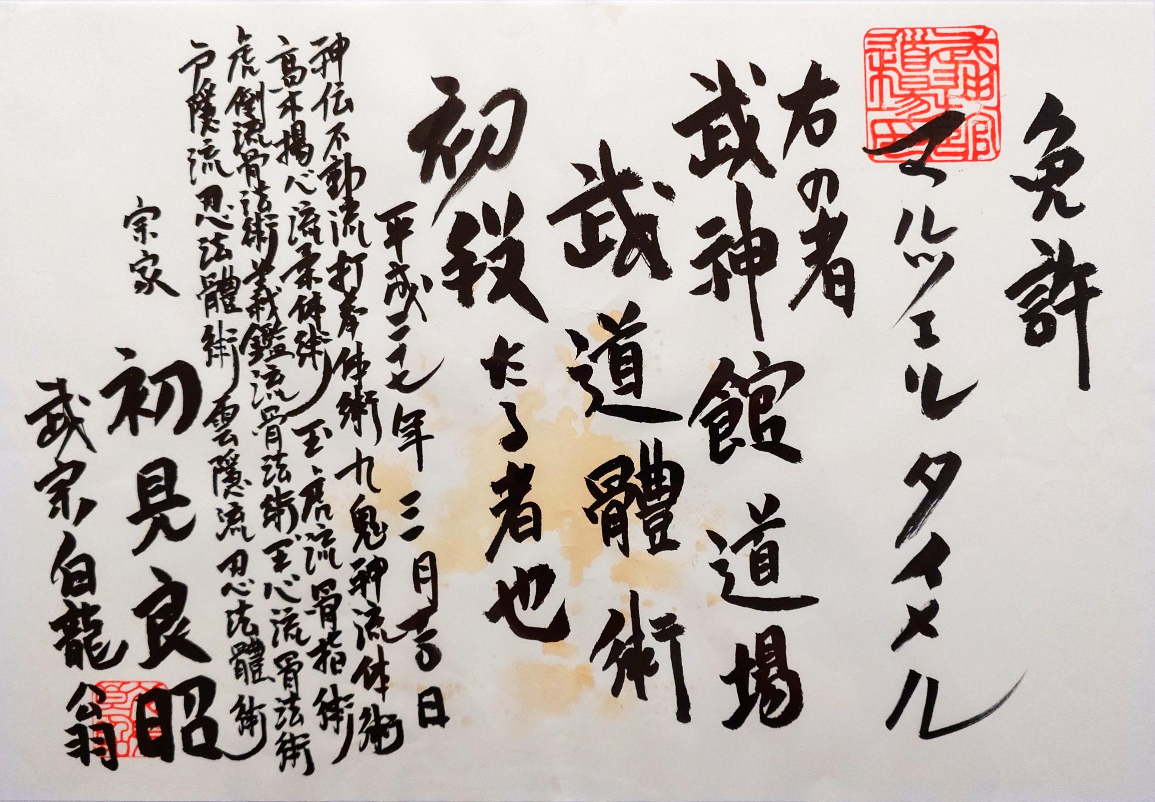 Marcel Taeumel [マルセル・テウメル] is a member in good standing of the Bujinkan Buyūkai [武神館武友会] (formerly Bujinkan Shidōshikai [武神館士道師会]) Teachers' Guild. After beginning his training in 2011, Marcel was awarded the following ranks in Bujinkan Budō Taijutsu [武神館武道体術]: